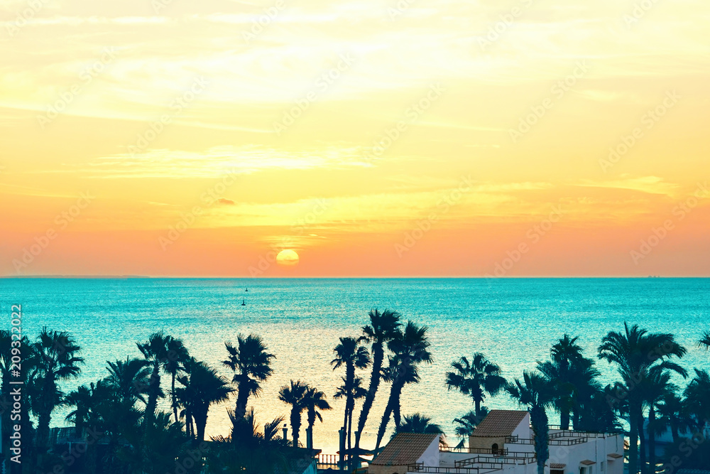 Luxurious tropical beach landscape. Silhouettes of palm trees against sky at sunset or dawn. Resort Hurghada Egypt.