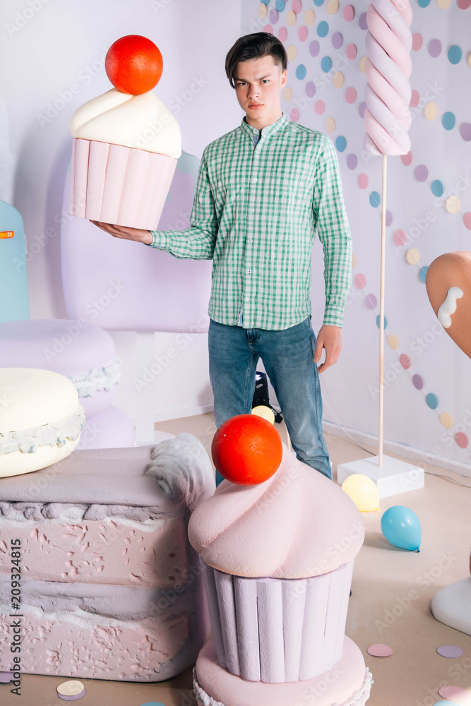 People, joy, fun and happiness concept. Relaxed happy birthday guy looking cheerful, smiling happily, holding cake