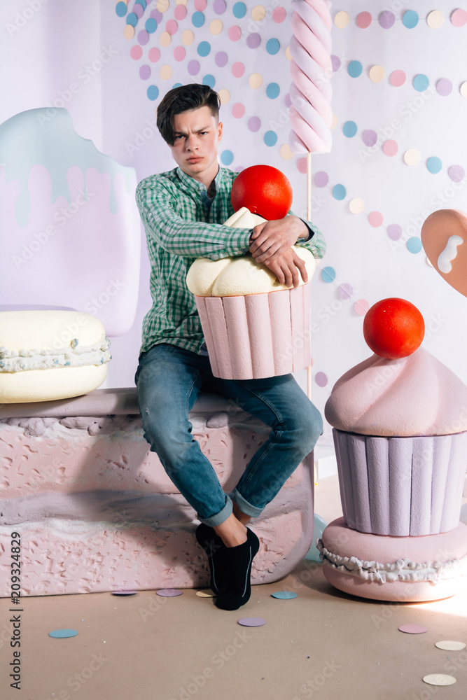 photo zone with candy bar, huge macaroons, sweets and hanging colorful fabric ice creams