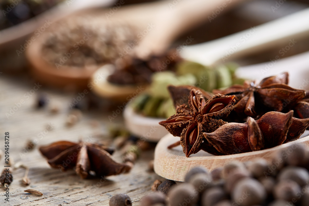Colourful aromatic various spices for cooking on old wooden barrel, close-up, flat lay, selective focus.