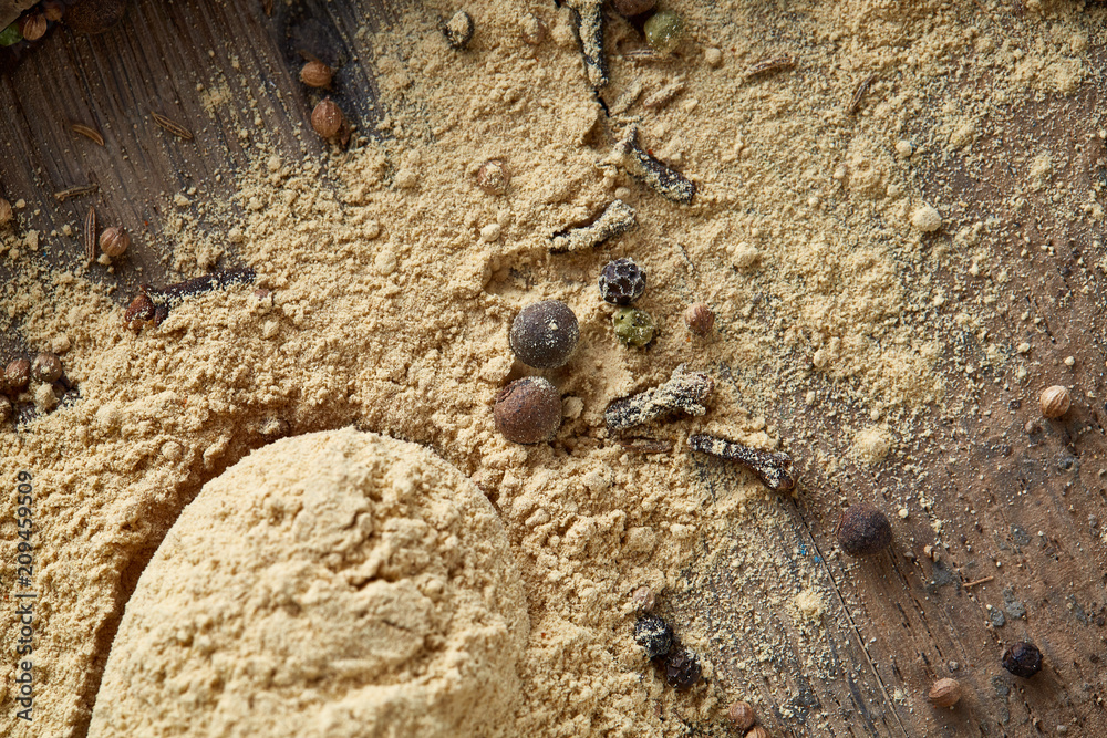 Top view of a wooden spoons full of paprica and black pepper on wooden barrel background, selective focus.