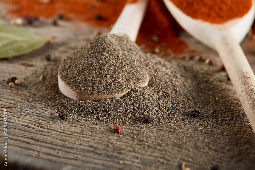Various spices in wooden spoons and bowls and some salt on an old wooden barrel, top view, close-up, selective focus.