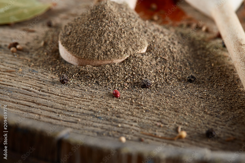 Various spices in wooden spoons and bowls and some salt on an old wooden barrel, top view, close-up, selective focus.