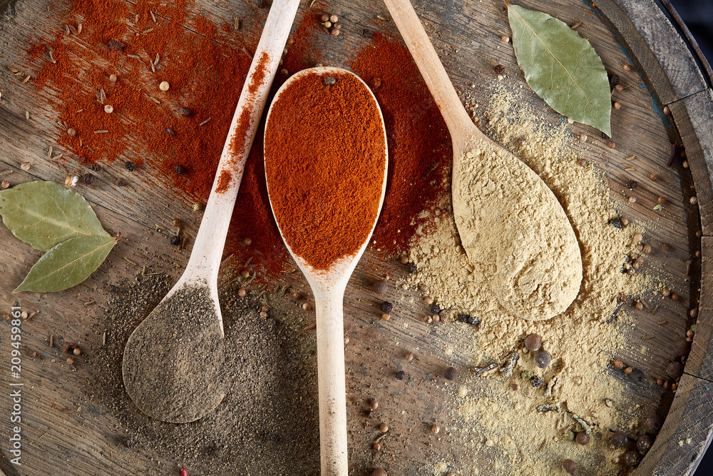 Various spices in wooden spoons and bowls and some salt on an old wooden barrel, top view, close-up, selective focus.