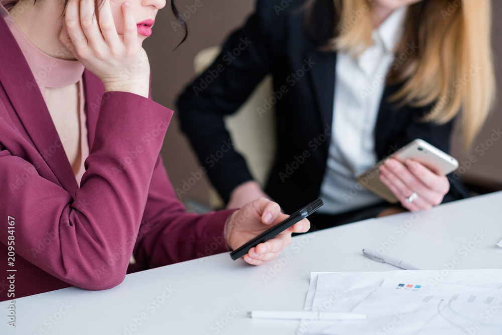 technology addiction. business women using their phones at office meeting. idle life and work style.