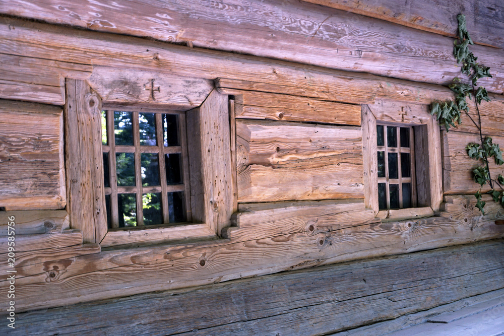 A small windows in the wall of an old wooden house
