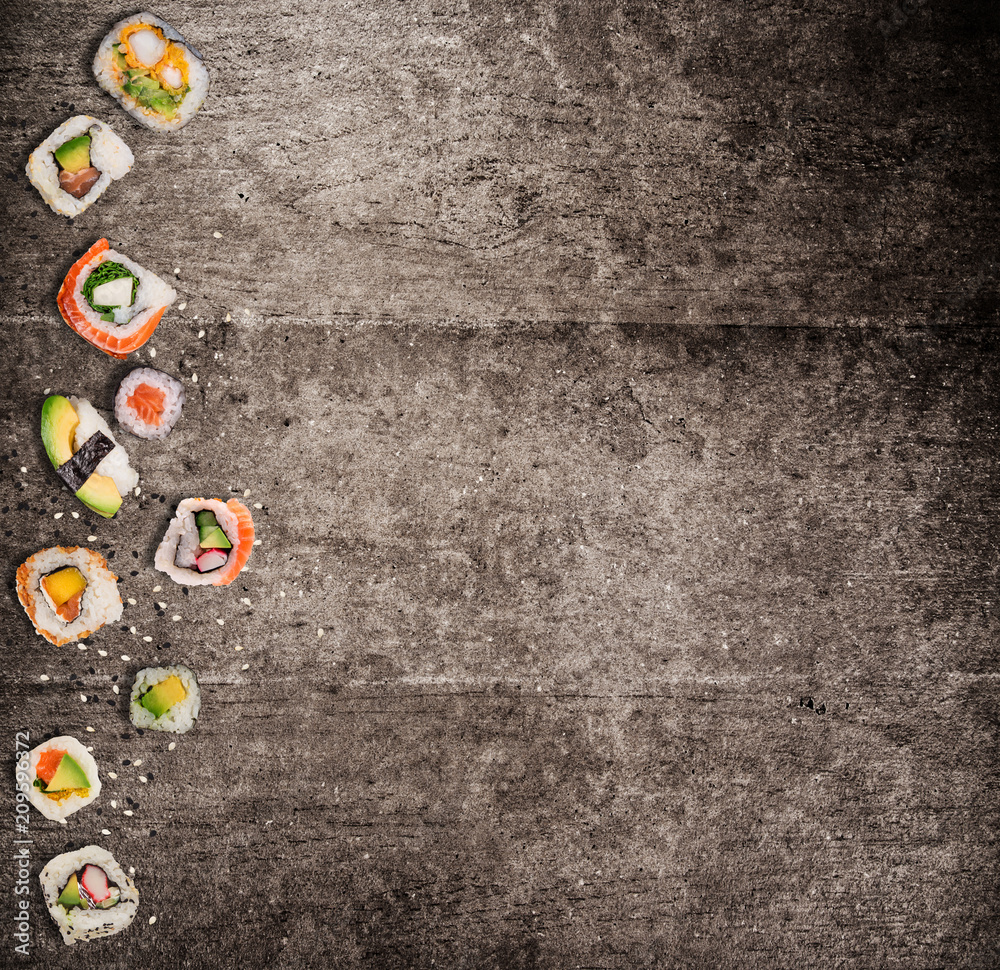 Traditional japanese sushi pieces on rustic concrete background.