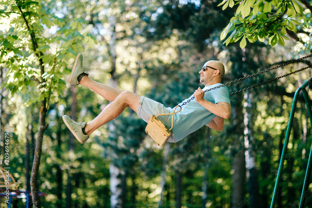 Adult stylish man in glasses riding on swing in city park on playground for children in summer. Happy guy remember childhood. Male person on attraction enjoying up and down motion. Odd boy outdoor.