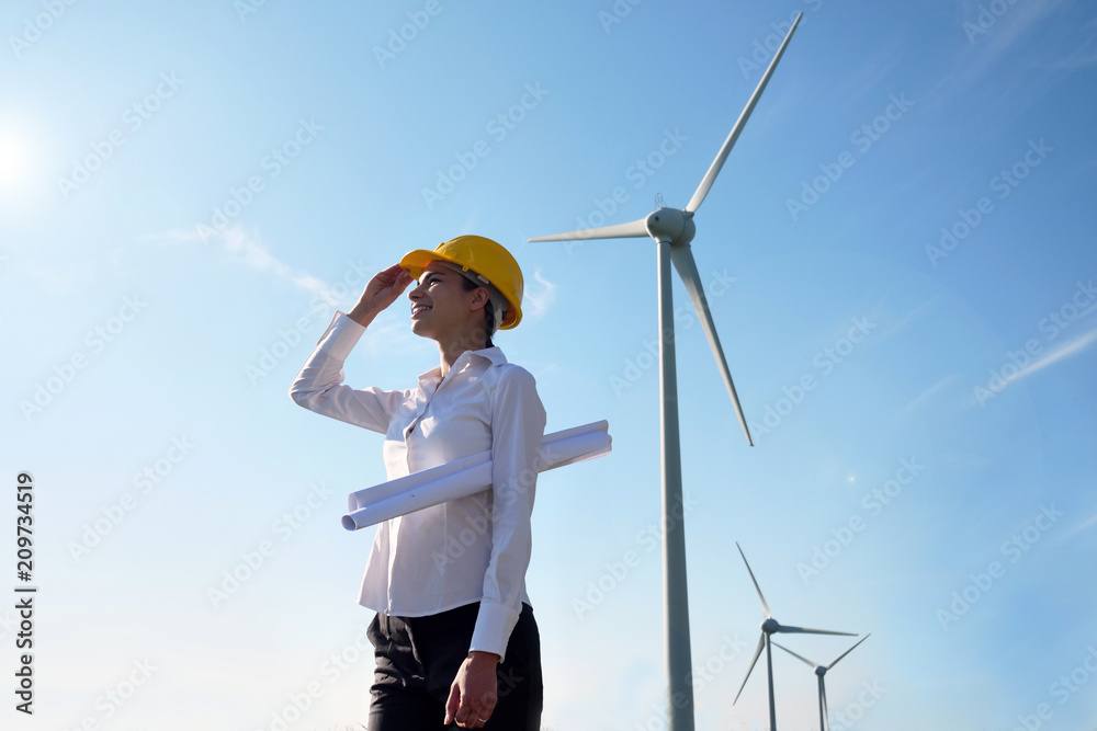 An engineer controls the functioning of wind turbines that run thanks to the force of the wind and generate electricity sustainably to the planet. Concept of: renewable energy, love for nature