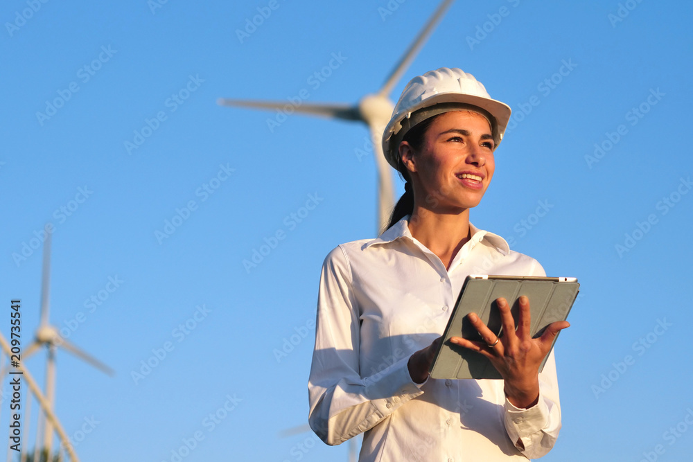 An engineer controls the functioning of wind turbines that run thanks to the force of the wind and generate electricity sustainably to the planet. Concept of: renewable energy, love for nature