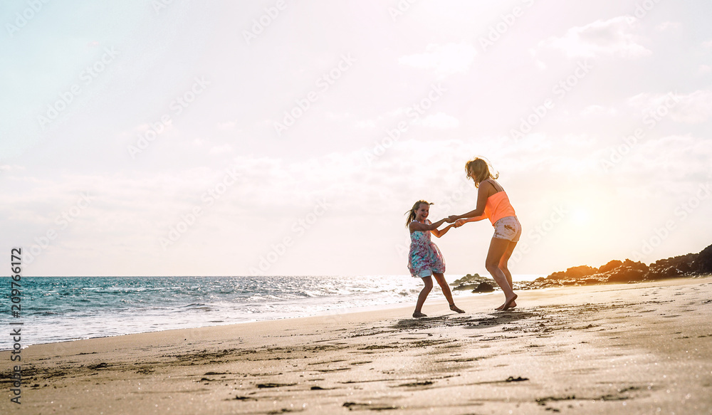 Happy loving family mother and daughter having fun on the beach at sunset - Mum playing with her kid next see in holidays - Parent, vacation, family lifestyle concept