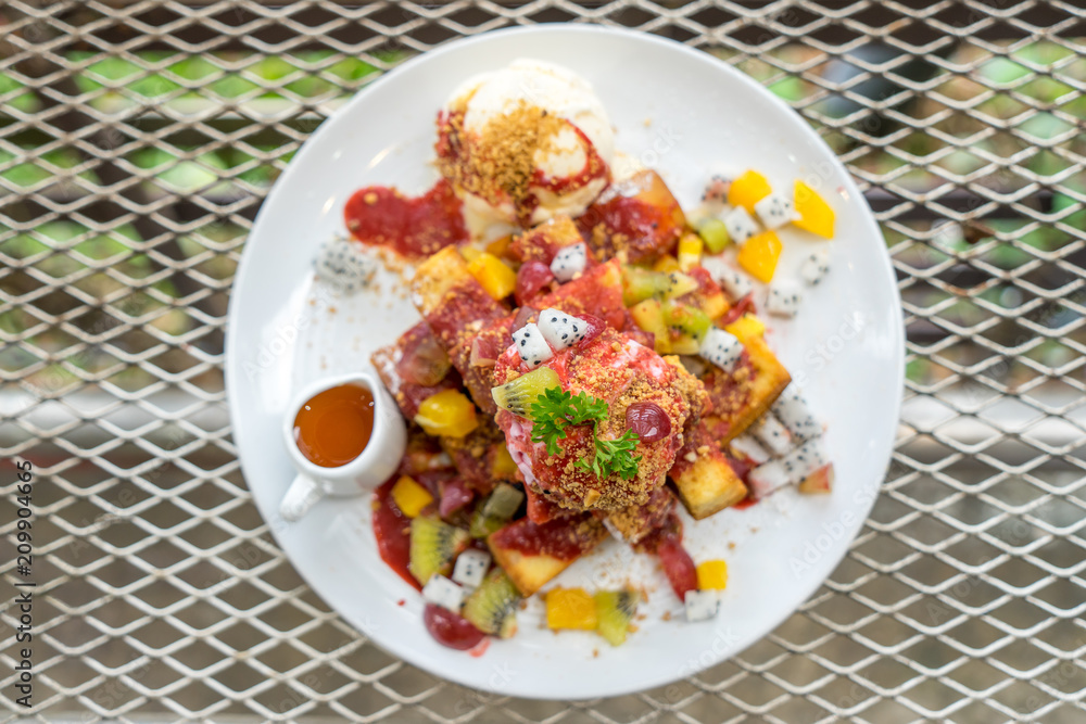 Dessert Honey toast with ice cream Vanilla mixed sliced fruits
