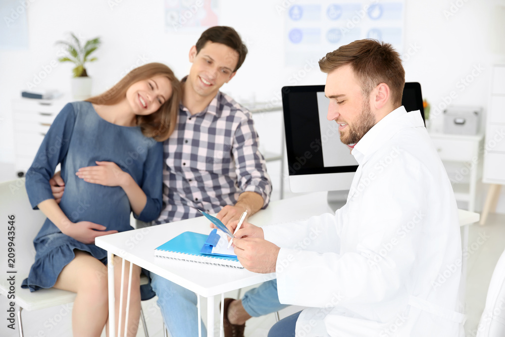 Gynecology consultation. Doctor showing ultrasound of baby to future parents in clinic