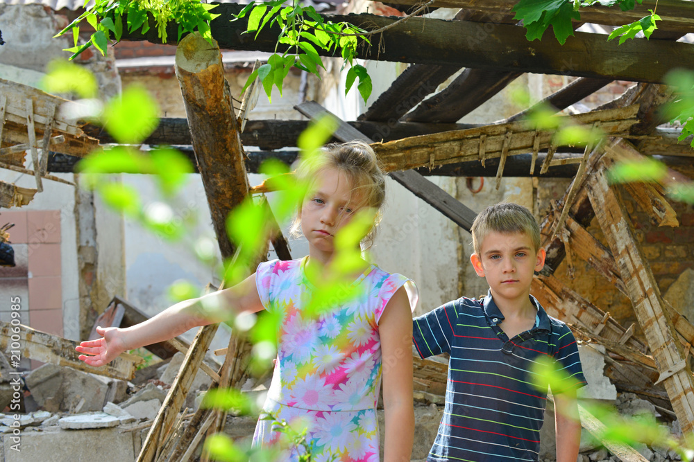 The sad orphan girl was left homeless and points to the ruins of the ruined building as a result of a military conflict, a fire and an earthquake. Photo production.