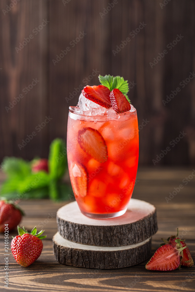 Fresh strawberry cocktail. Fresh summer cocktail with strawberry and ice cubes. Glass of strawberry soda drink on dark background.