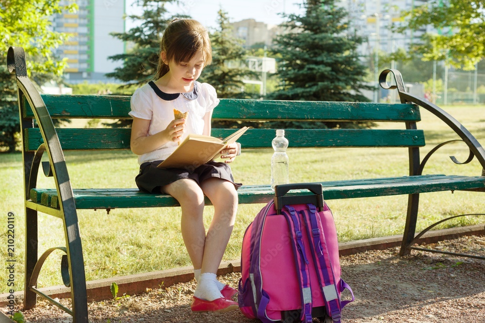 Portrait of schoolgirl 7 years old on a bench reading book, eating ice cream. Background school yard