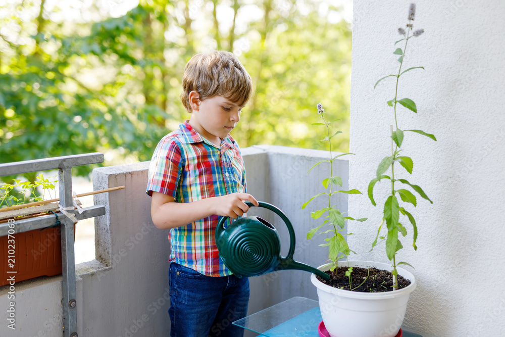 Active little preschool kid boy watering plants with water can at home on balcony