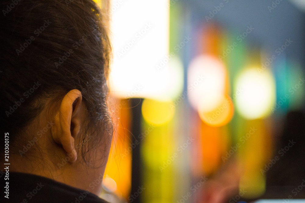 blur adult woman thinking with colorful abstract background in internet cafe . business concept style .