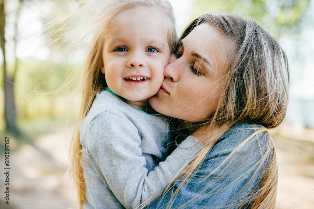 Happy smiling mother hugging her lovely little daughter outdoor. Lifestyle family. Adult cheerful female parent playing with her beautiful emotional child at nature in summer. Positive people faces.