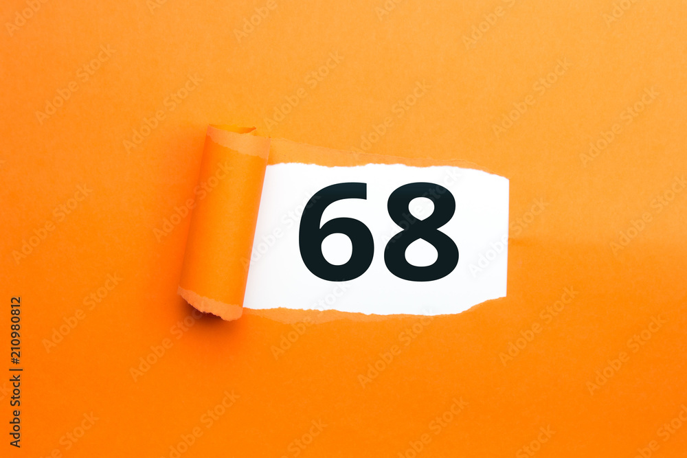 Zahl achtundsechzig - 68 verdeckt unter aufgerissenem orangen Papier