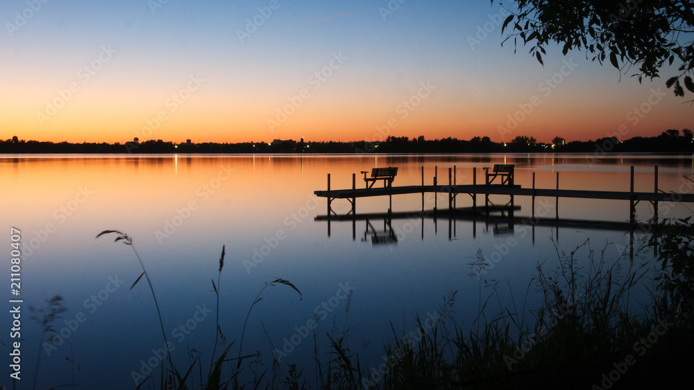 Bemidji, Minnesota, the Best Town in Minnesota is seen across Lake Irving, the first lake on the Mississippi River, after sunset in summertime. A dock is seen in the foreground in this night photo.