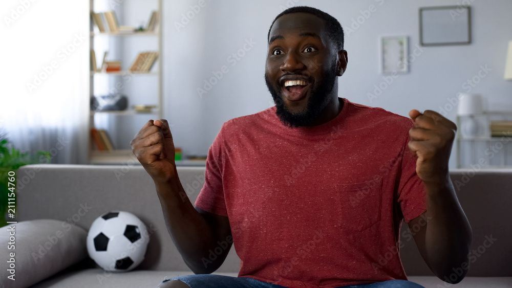 Cheerful sports supporter victoriously screaming watching match on tv, cheering