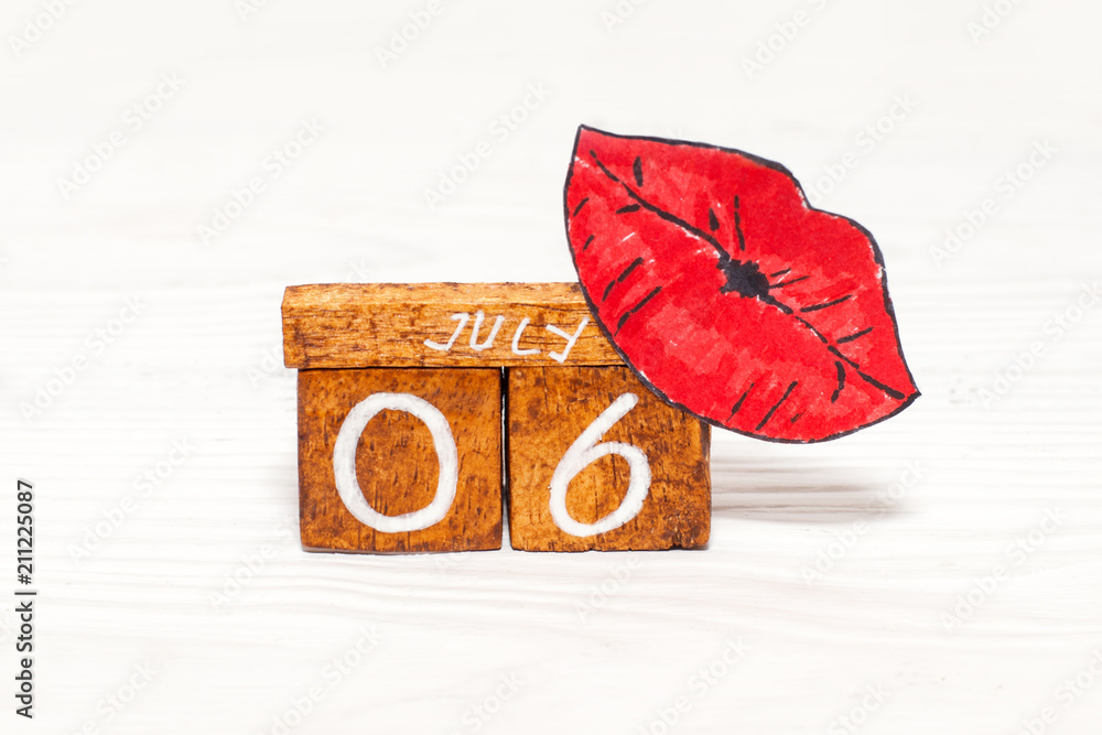 Jule 6th - World Kiss Day on wooden calendar with funny picture of kiss