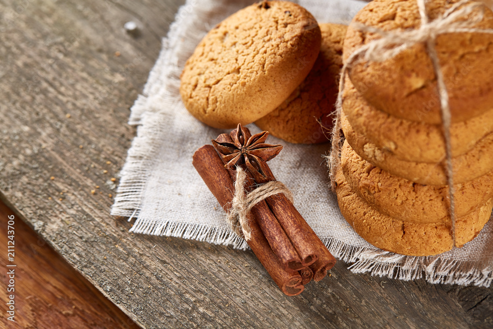 Homemade cookies on homespun napkin over wooden table, close-up, selective focus