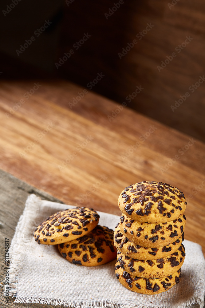 White cup of tea and cookies on a log over country style wooden background, close-up, selective focus
