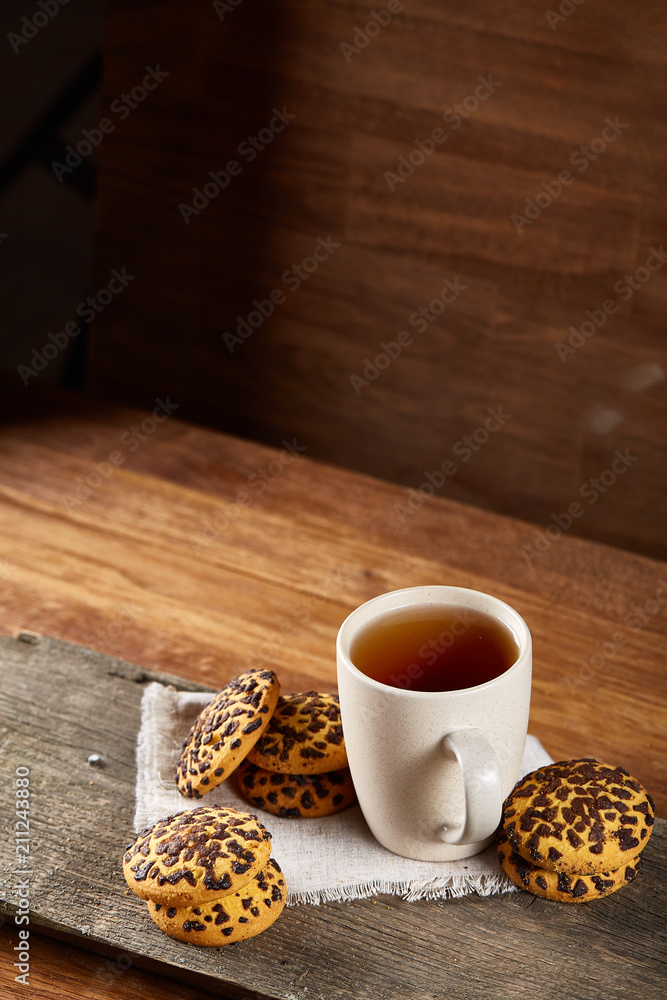White cup of tea and cookies on a log over country style wooden background, close-up, selective focus