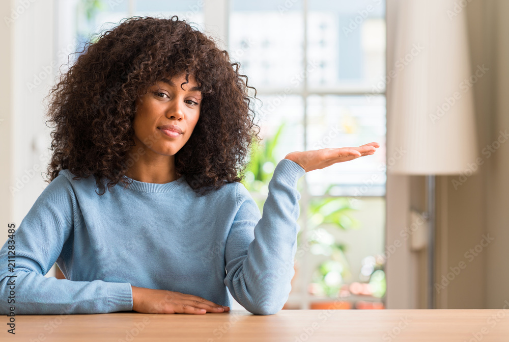 African american woman at home smiling cheerful presenting and pointing with palm of hand looking at the camera.