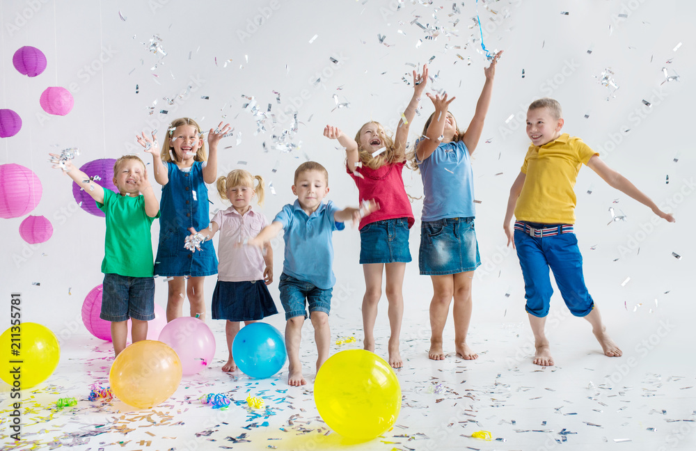 Group of seven 7 children play with air balloons, confetti in light room on birthday party