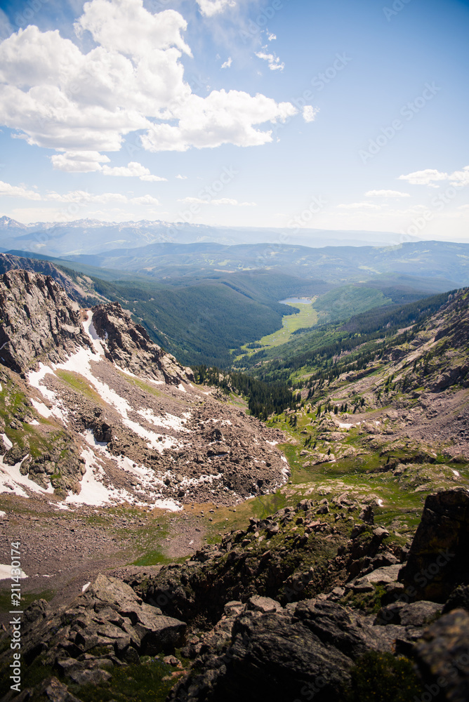 Landscape view overlooking Piney Lake and the Rocky Mountains from the summit of the Gore Range,