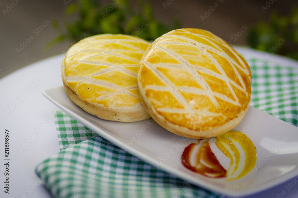 Lanche. Empadas salgado tipico brasileiro servido em uma mesa decorada.