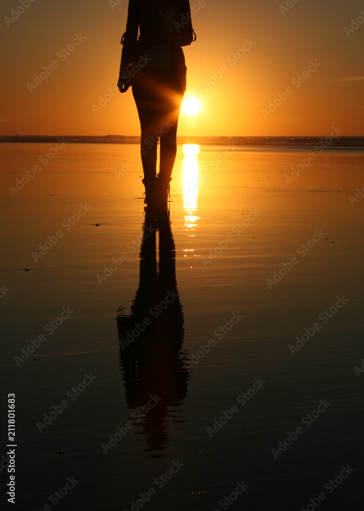 Silhouette of a woman walking towards the camera on a beach at Sunset, Essaouira, Morocco