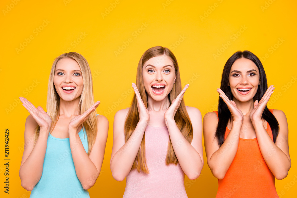 Great! Portrait of amazed pleased trio holding palms near face having good news information isolated on vivid yellow background