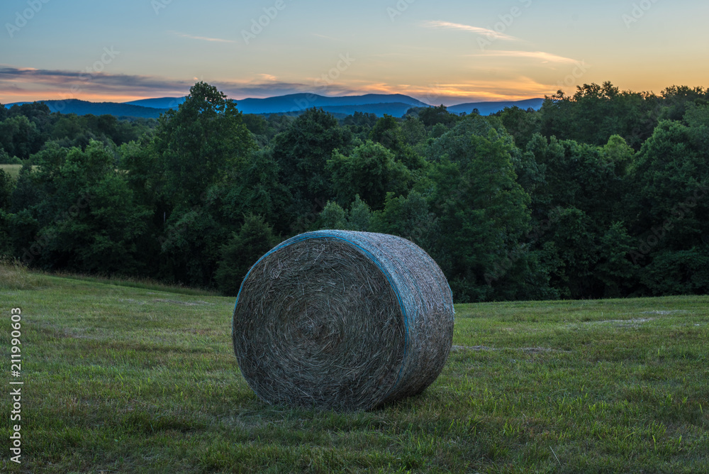 Hay in farm field with mountains and sunset looking out towards the Shenandoah National Park.