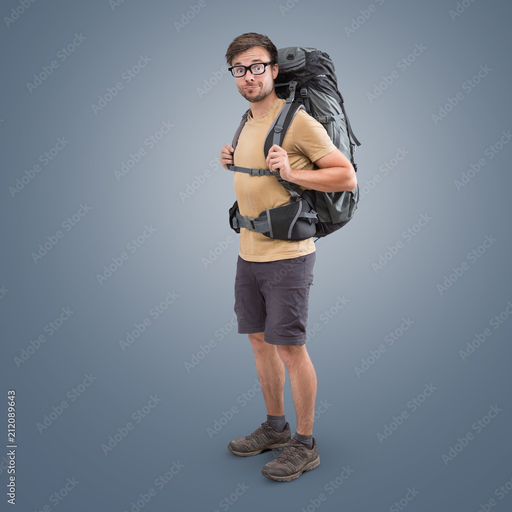 Wanderer mit großem Rucksack und kurzer Kleidung