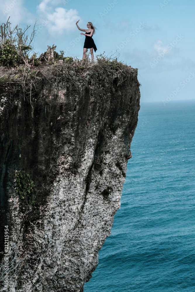 Pretty girl doing selfie photo while standing on the cliff with amazing ocean and cloudy sky view