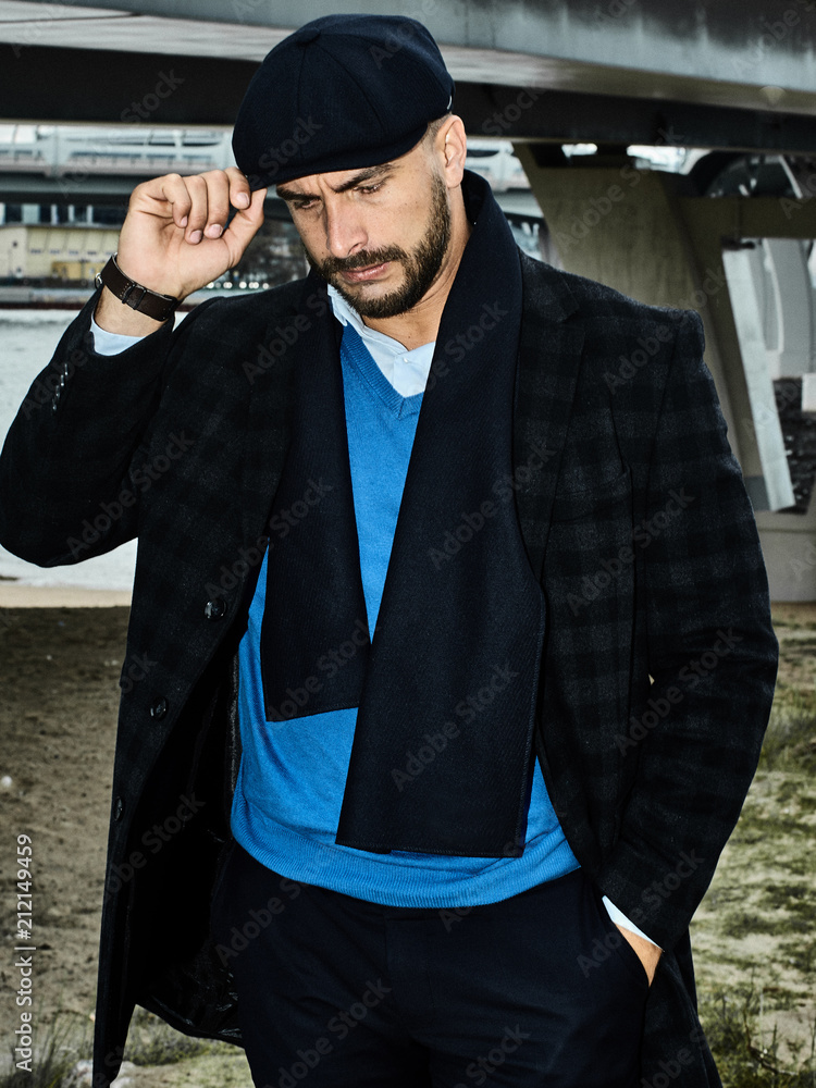 Beautiful portrait of a man in a cap. Cap of different colors and shapes. Autumn portrait, clouds behind and stormy sky. Scarf around the neck in the color of the cap. Face severe, serious.