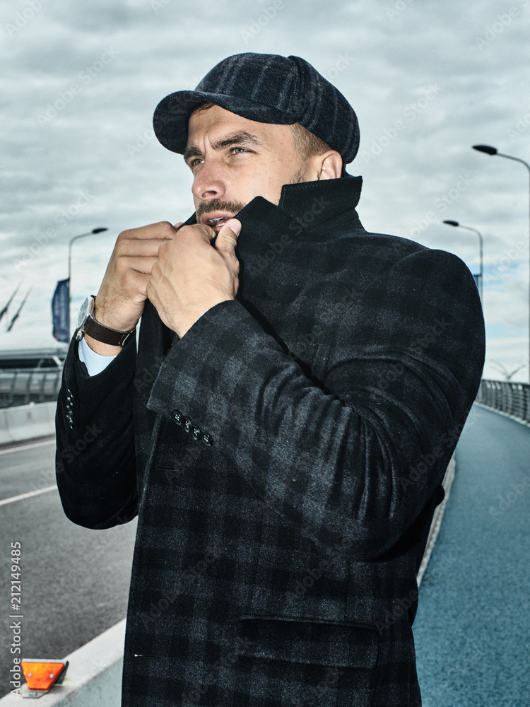 Beautiful portrait of a man in a cap. Cap of different colors and shapes. Autumn portrait, clouds behind and stormy sky. Scarf around the neck in the color of the cap. Face severe, serious.