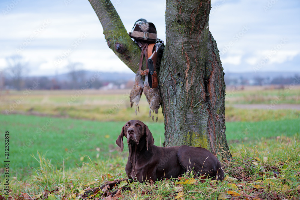 A young, pure blooded dog is lying in the lawn near the tree. On a branch hangs a weapon, a hat with a feather, a prsy is hanging on the lace. A hunting scene.