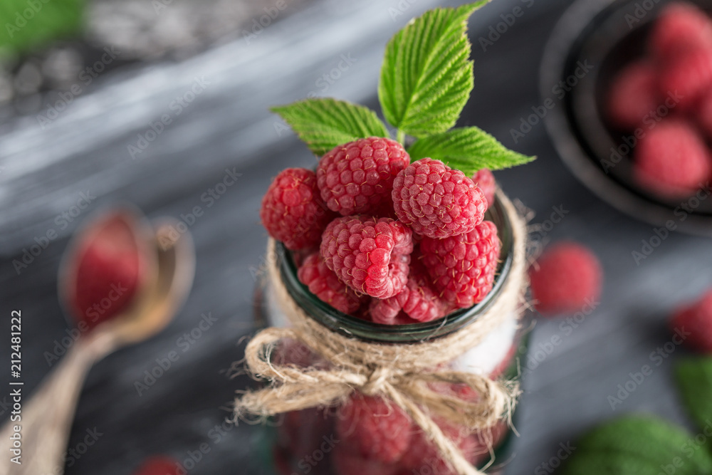Raspberry in a glass jar on dark wooden background. Raspberry background. Healthy food concept. Fresh organic berries