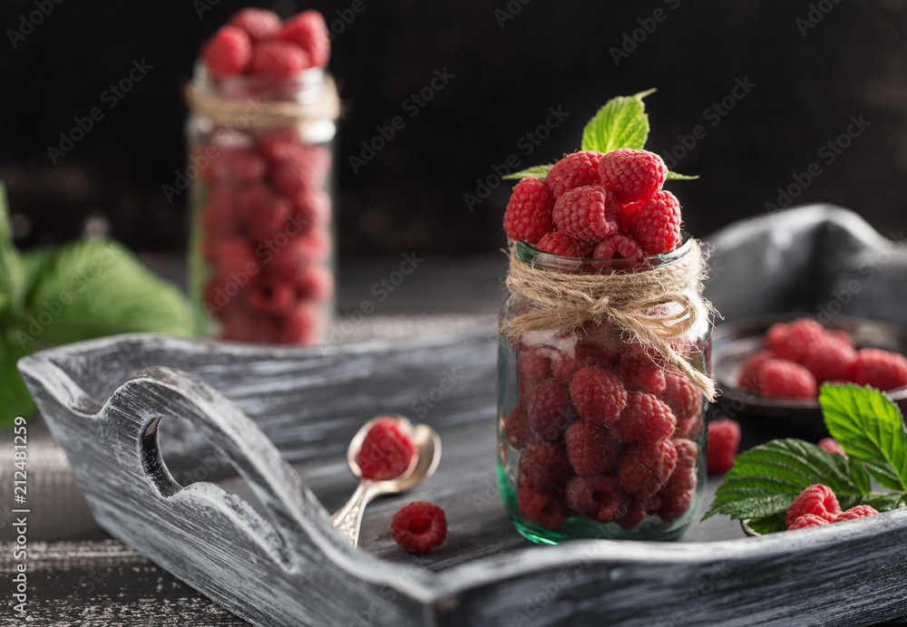 Raspberry in a glass jar on dark wooden background. Raspberry background. Healthy food concept. Fresh organic berries