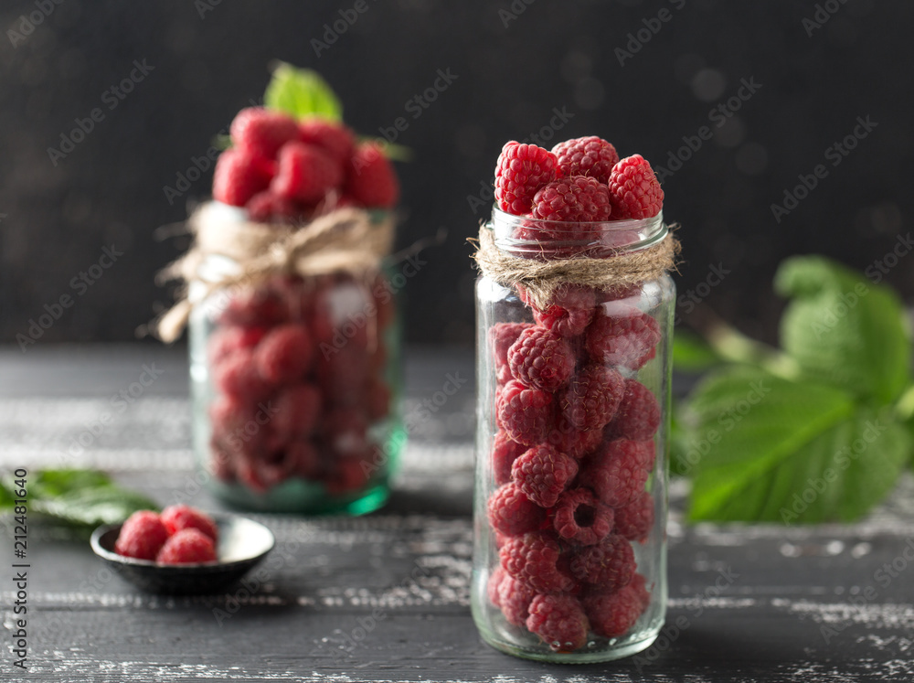 Raspberry in a glass jar on dark wooden background. Raspberry background. Healthy food concept. Fresh organic berries