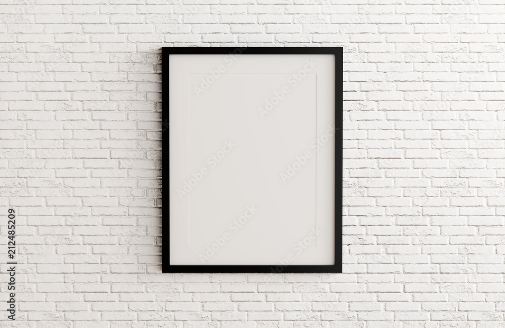 Blank black picture frame template for place image or text inside on white brick wall.