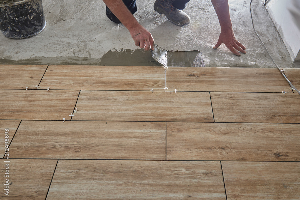 Hands of the tiler are laying the ceramic wood effect tiles on the floor