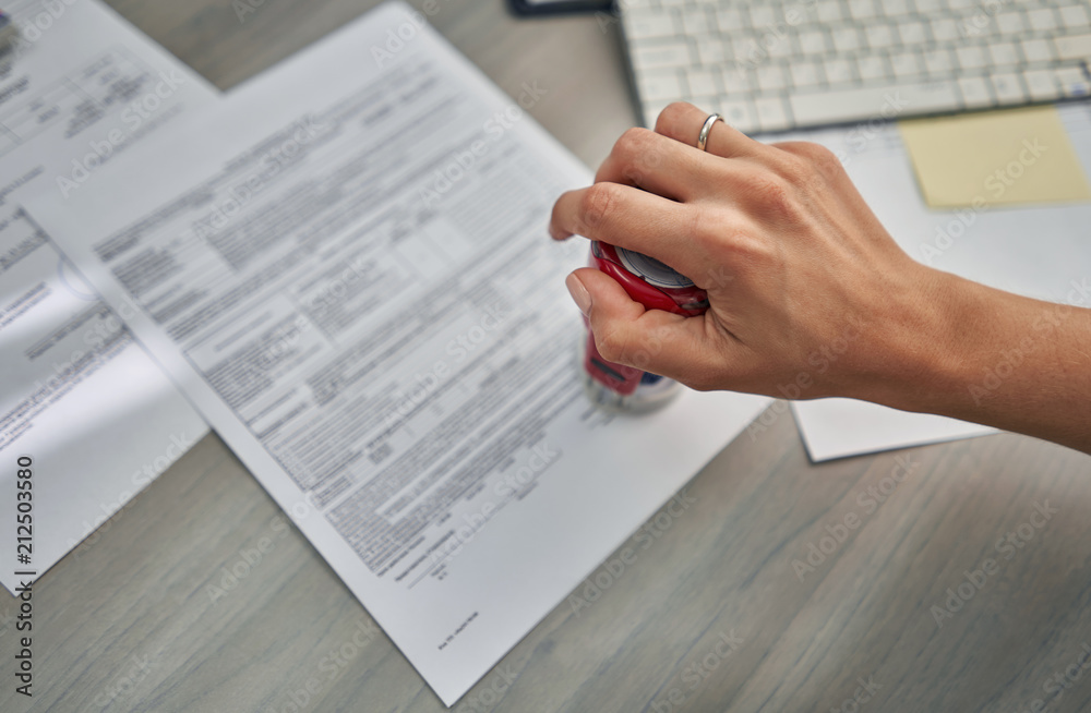 girl in the office puts a stamp on the documents