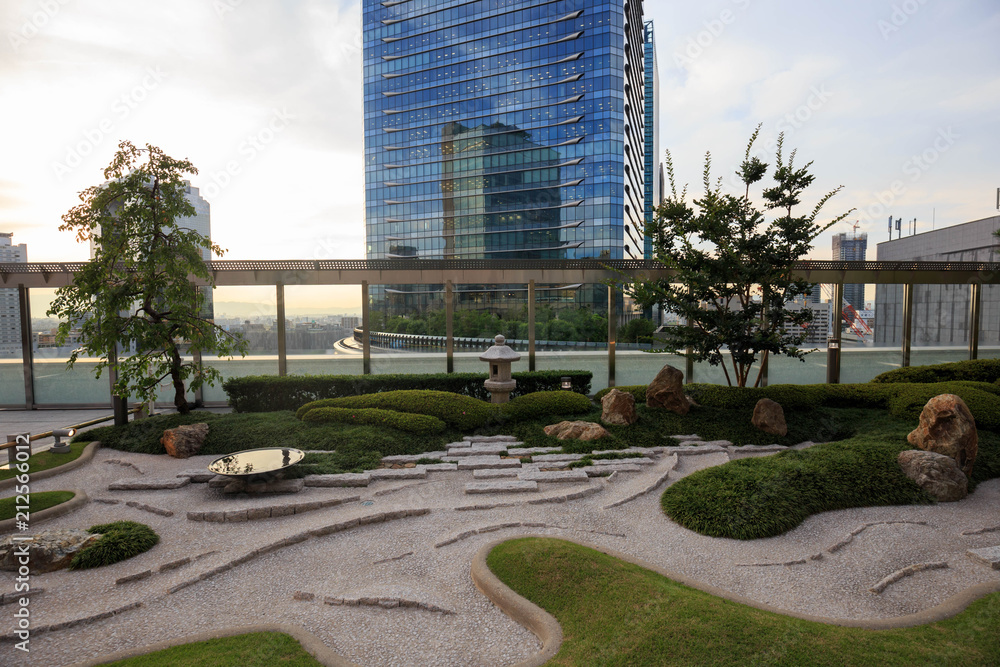 Small Japanese rooftop rock garden surrounded by green grass and bushes in city center