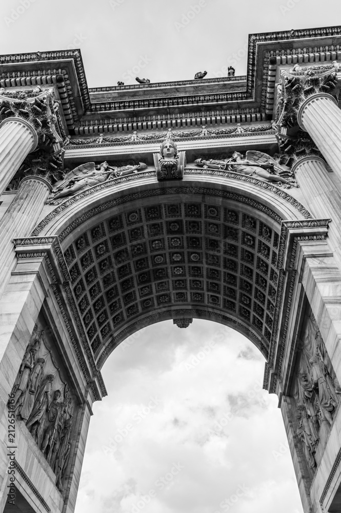 Close-up for arch of the Arch of Peace in Mialn, Italy. Porta Sempione in Black and white.